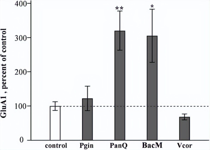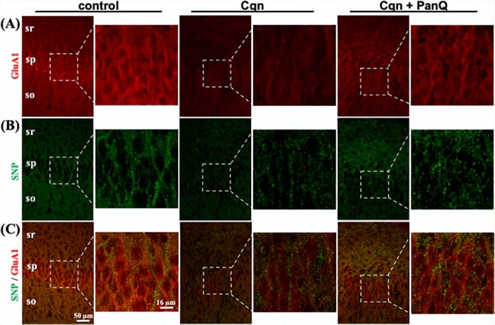 免疫细胞化学分析进一步证实了PanQ的突触保护作用。对照组织显示锥体细胞场中神经元周围有密集的点状突触后GluA1染色,Cqn处理导致前后突触免疫标记显著减少,而PanQ预处理则显著保留了突触标记。