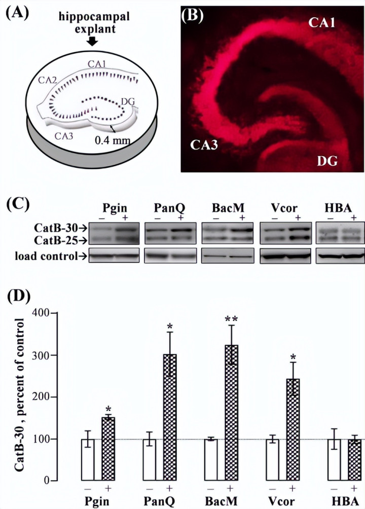 研究团队建立了一套高效的海马体外植体筛选平台,用于评估天然产物对ALP的关键成分CatB的调节能力。实验采用Sprague-Dawley大鼠乳鼠(出生后12天)的海马组织,制备400μm厚度的切片,在Biopore膜培养插入物上培养18-20天使其成熟。每天向培养介质中添加测试提取物,包括美洲人参(PanQ)、亚洲人参(Pgin)、巴柯巴(Bacopa monniera, BacM)和蓝莓(Vaccinium corymbosum, Vcor)等,浓度范围为20-500μg/mL。