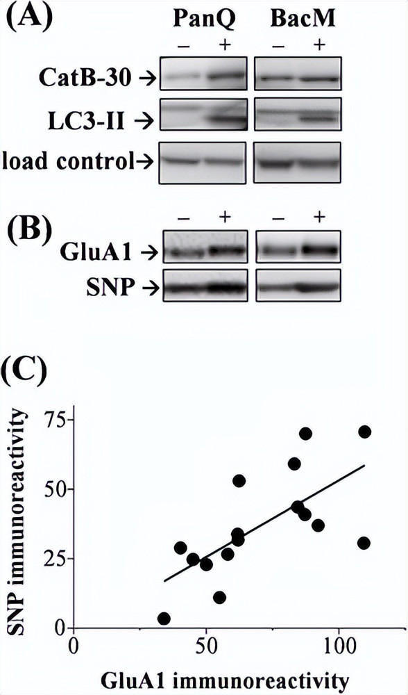 更重要的是,CatB增强与突触标记物改善显著相关。PanQ和BacM处理的海马体外植体中,突触前蛋白(synaptophysin, SNP)和突触后蛋白(GluA1)水平均显著增加,表明突触完整性得到增强。线性回归分析显示,PanQ处理样本中CatB-30与GluA1水平呈显著正相关(R²=0.574, p=0.001),而BacM的这种相关性较弱。
